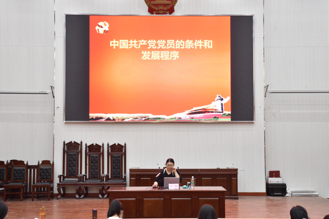 党委副书记余果在模拟法庭开展最后一次党课《中国共产党党员的条件和发展程序》。她首先为与会积极分子讲解了入党的基本条件、党员的八项权利与八项义务;其次通过发展党员工作总体要求、基本原则、发展对象条件、预备党员接收与转正程序等多方面讲述了发展党员工作的方针和程序。这堂课“干货”满满,她的讲解不仅使与会积极分子详细了解了党员发展的全部流程,也促进学院党员发展工作更加完善、更加规范。