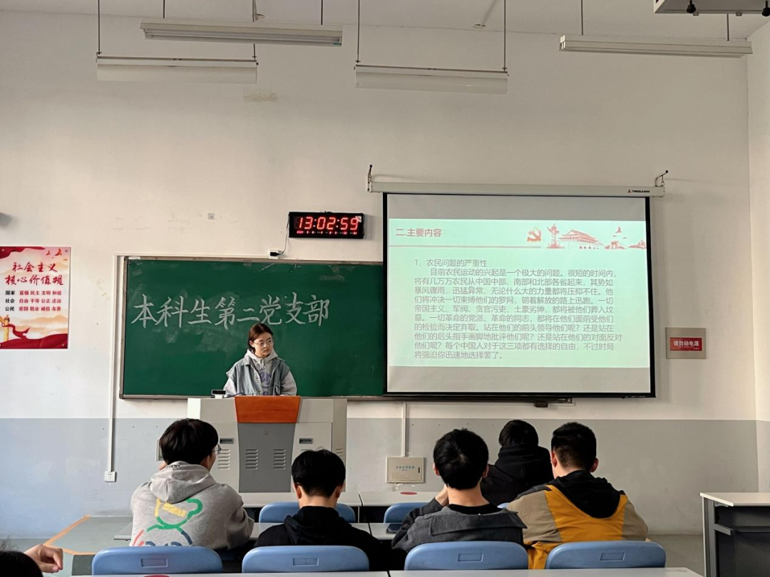 学生党员孙墁澧同志为大家讲解了《湖南农民运动考察报告》是毛泽东同志面对一九二六年至一九二七年在湖南发生的轰轰烈烈的农民革命运动而进行的生动描述和深入研究。用事实驳斥了当时党内对农民运动的轻视、甚至抛弃农民这个重要的同盟军的问题,揭示了农民阶级也是中国革命的主力军,是中国解放的积极参与者。认为农民运动将在“很短的时间内,将有几万农民从中国中部、南部和北部各省起来,其势如暴风骤雨,迅猛异常,无论什么大的力量都将压抑不住。他们将冲决一切束缚他们的罗网,朝着解放的路上迅跑。一切帝国主义、军、贪官污吏、土豪劣绅都将被他们葬入坟墓。一切革命的党派,革命的同志都将在他们的面前受他们的检验而决定弃取。”农民并不是被动受他人支使而是自发的起来解放自己,不是受别人弃取,而是检验弃取别人。