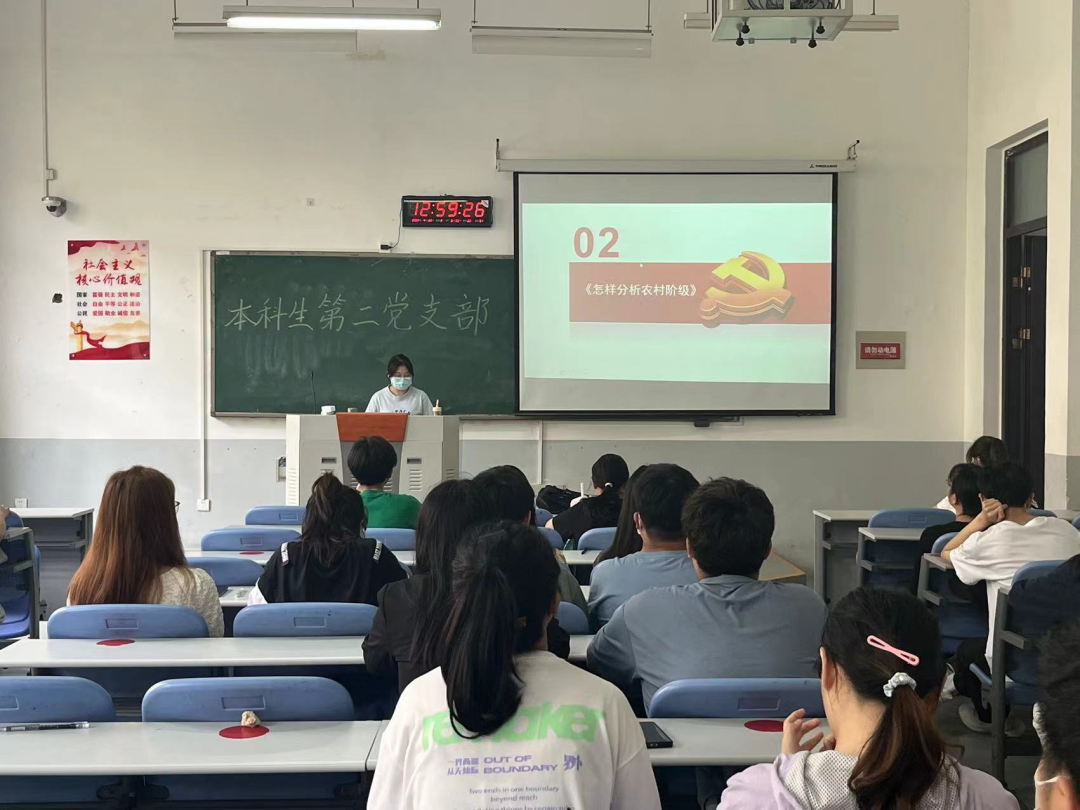 学生党员师双辰首先向大家分享了《怎样分析农民阶级》一文的写作背景。接着从内容展开,毛泽东的《怎样分析农村阶级》成为了划分农民阶级成分的标准。最后她分享了自己的读后感悟并于大家交流,主要包含以下几点:1.工作中出现偏差,立即改正。不要顾及脸面维持错误,把事干成才是最重要的。2.毛泽东延续了《中国社会各阶级的分析》以来的从经济基础分析处罚的分析方法。3.使用分类思想,面对庞大的农民群体,毛泽东通过设置一定的标准对不同层次的农民进行分类,从而便于工作的开展。处理日常事务时进行轻重缓急的划分,这样会大大提高效率。