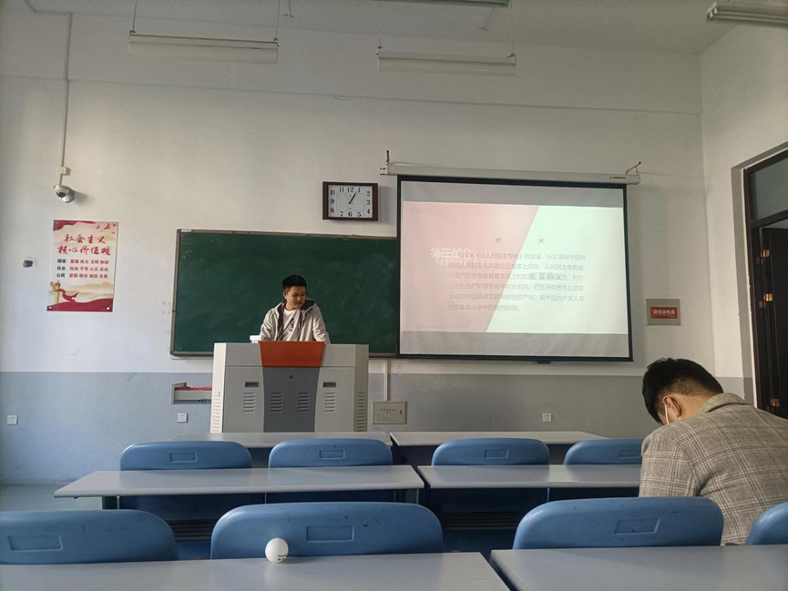 学生党员郭珂玮跟大家分享了毛泽东选集中《论人民民主专政》的部分,他主要从三个方面介绍了本文,首先是中国共产党人在夺取全国政权以后,要建立一个什么样的国家和实行什么样的社会制度;其次他从为什么建立人民民主专政、人民民主专政的完整公式等五个方面介绍了本文的内容;最后他鼓励各位学生党员要认真学习毛泽东思想,不断坚定自身理想信念。