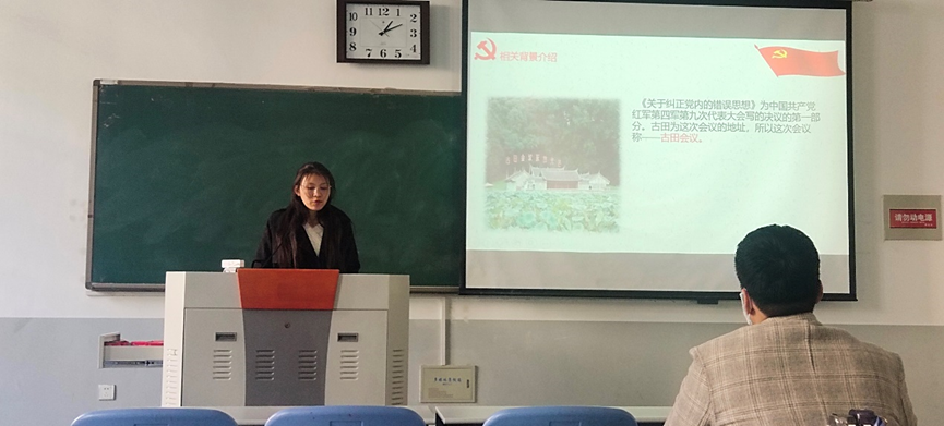 学生党员陈安琪以古田会议精神为引,与大家一起学习了《关于纠正党内错误思想的文章》,重点介绍了“反对绝对平均主义”。从绝对平均主义的来源,相关的状况讲起,以纠正的方法“各尽其能按劳取酬”结尾,加深对当代社会实行的按劳分配为主体、多种分配方式并存的制度的了解,增强制度认同感。