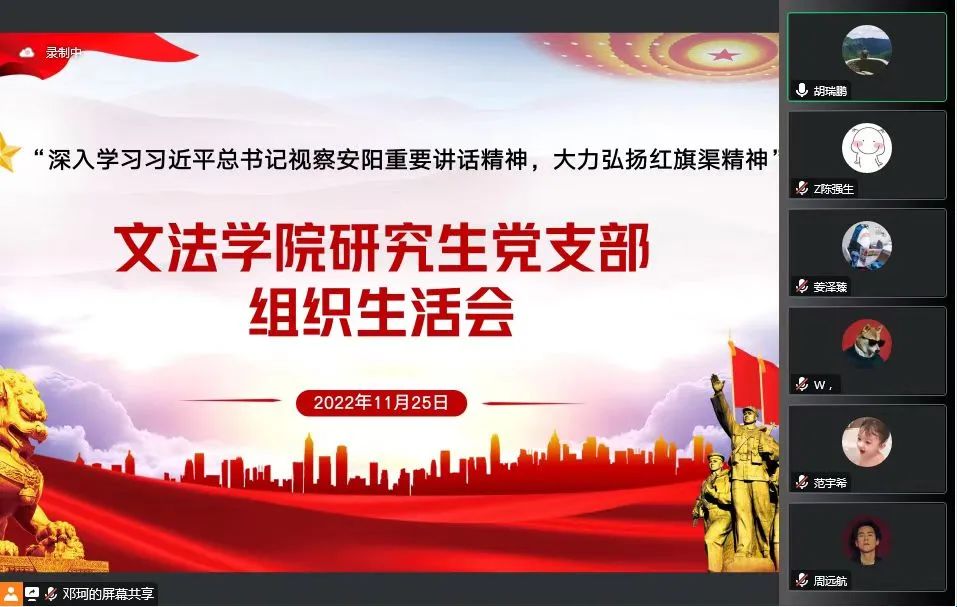 11月25日晚,91自拍 研究生党支部通过网络平台腾讯会议召开“深入学习习近平总书记视察安阳重要讲话精神,大力弘扬红旗渠精神”专题组织生活会,会议由党支部书记邓珂主持。