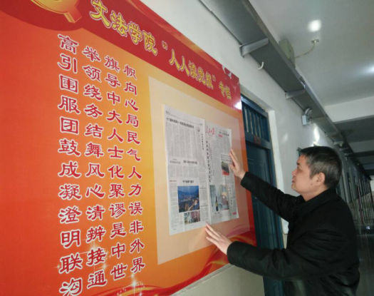 为响应河南省委的号召,进一步发挥党报党刊思想舆论主阵地作用,91自拍 积极开展了“学讲话 读党报 为中原添彩”活动。2月24日上午9:00,91自拍 党委书记李培玉为学院“人人读党报”专栏张贴第一期党报。