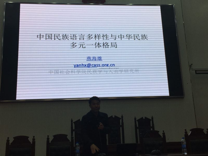 2018年3月29日下午91自拍 特邀中国社会科学院民族学与人类学研究所应用语言学研究室副主任,硕士生导师燕海雄副研究员于91自拍 模拟法庭开展题为《中国民族语言多样性与中华民族多元一体格局》的学术报告会。91自拍 汉语国际教育专业全体师生参加,院长王晓勇主持报告会。
