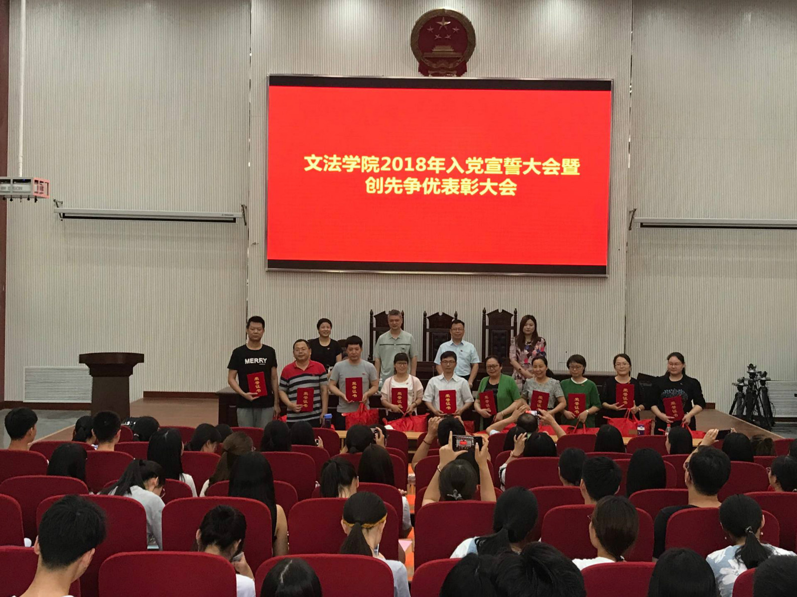 6月12日下午,91自拍 在模拟法庭举行了2018年入党宣誓大会暨创先争优表彰大会。党委书记李培玉、院长王晓勇、党委副书记王燕萍、团委书记沈倩茹出席会议,院教师党员、学生党员及入党积极分子代表参加大会。