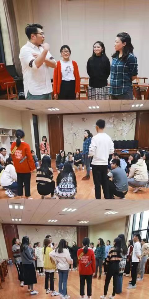 戏剧刚开始,老师就带同学们来了一个有趣的热身运动, 体验者们在亭子老师的带领下,进行动作传递, 接下来是小伙们的自我介绍环节,体验者们轮流上前介绍自己,并做出相应动作,其他体验者一起进行动作重复。自我介绍完后,开始了即兴戏剧的内容。即兴体验环节的极限链条中,有名字,有城市,有眼神,有信念。小伙伴们就这样把信念传给下一个目标,给予,接收,反馈。在即兴戏剧中产生发自内心的天然的快乐,开心看别人,尽兴做自己。一个没有任何构建的故事,在体验者的演绎中,变得生动可感;体验者也在其中收获了不尽欢喜,大家都从中体验到了即兴戏剧的魅力。