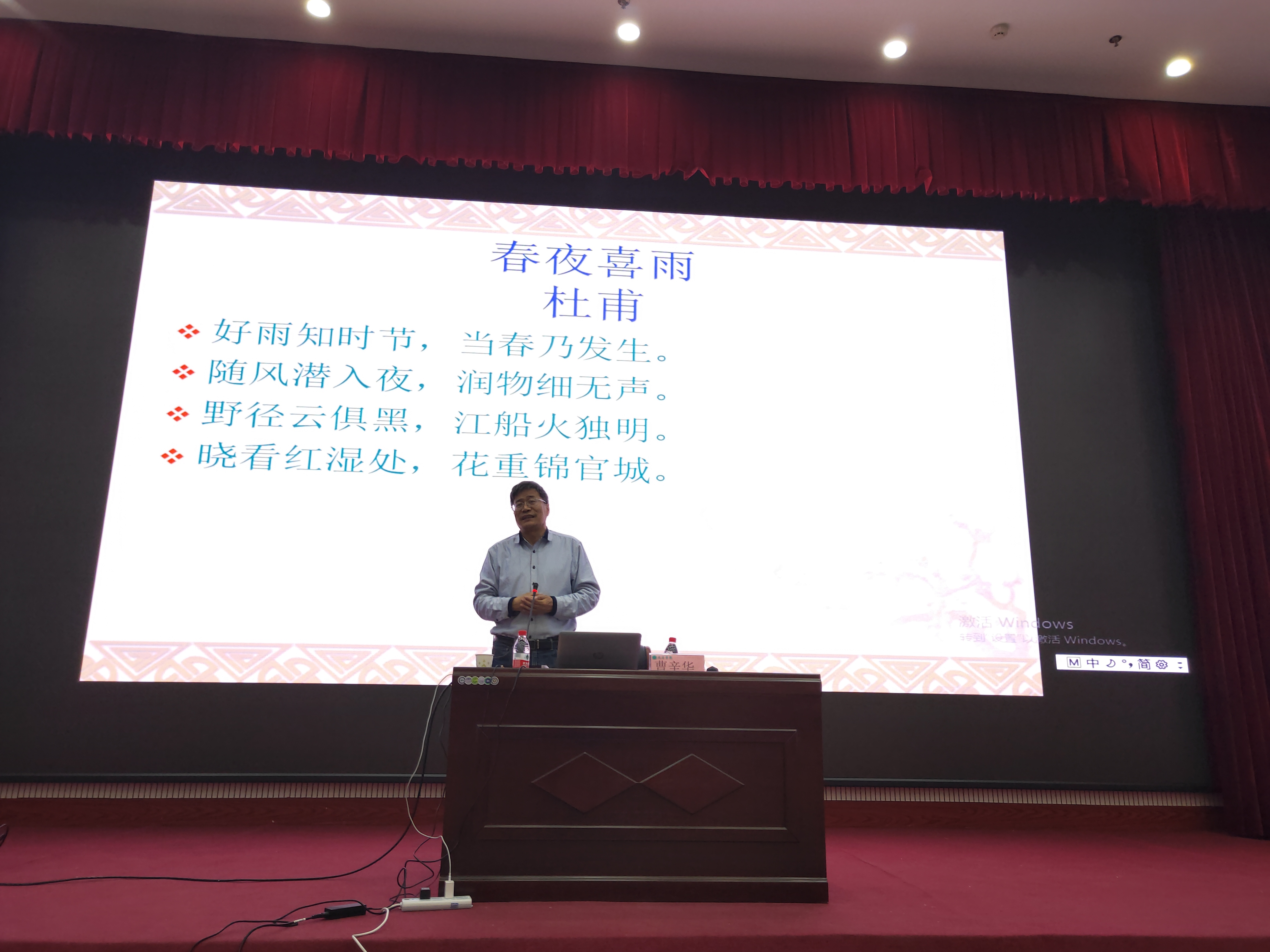 讲座伊始,曹辛华教授从自己为何与诗歌结缘谈起,为学生讲述了自己的成长和求学过程,他真实而又幽默的表达拉近了与学生们的距离。然后,曹辛华教授感情充沛地朗诵了多首耳熟能详的诗歌,并以此为例讲解了诗歌朗诵方法,他又将诗歌与豫剧巧妙结合,同时兼有流行歌曲的糅合,进一步吸引了大家对诗歌和豫剧的兴趣,现场掌声接连不断。接下来,曹辛华教授节奏一改,用专业词汇讲解了唐诗宋词的形成原理,并详细解释了“生诗”与“填词”,辅之以典型诗词,促进学生理解。最后,曹辛华教授展示了多首自己所做诗词,用现代歌调深情演唱,并与老师和学生互动,在欢快的气氛中,诗词与流行乐发生了碰撞,生出美妙的乐章,在座的老师与学生都收获满满,各有感悟。