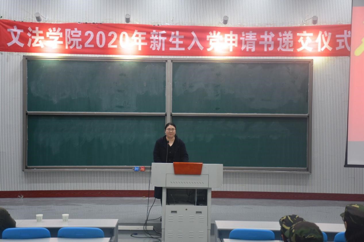 在庄严的国际歌中,2020级新生依次上前,向院党委副书记余果和辅导员王鹏举递交入党申请书。