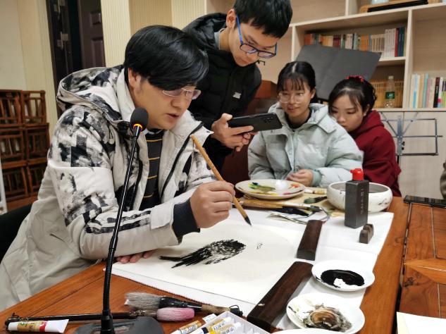 实践教学环节,党军成现场向与会师生展示国画创作,笔笔勾勒,点点晕染,或淡雅劲爽,或大气磅礴。笔下春风,怎一个妙字了得。党军成从笔、墨、纸等作画材料的准备到开始创作,始终佐以专业细致的讲解,使在场师生受益匪浅。与会师生在老师的熏陶下纷纷执笔,伏首案前,挥洒笔墨。