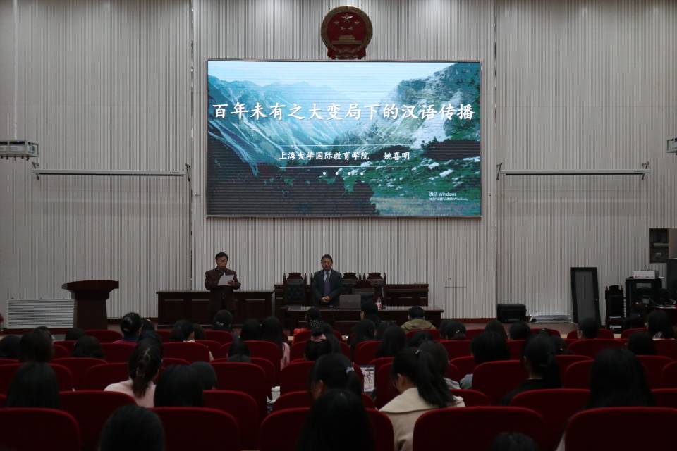 于龙子湖校区模拟法庭举办主题为“百年未有之大变局下的汉语传播”的专题讲座。特别邀请世界汉语教学学会教师发展专业委员会会员、中国高教学会外国留学生教育管理分会常务理事、中国先秦研究会国学双语研究分会常任理事、上海大学国际教育学院院长姚喜明来院进行专题讲解,学院师生代表参与此次讲座。