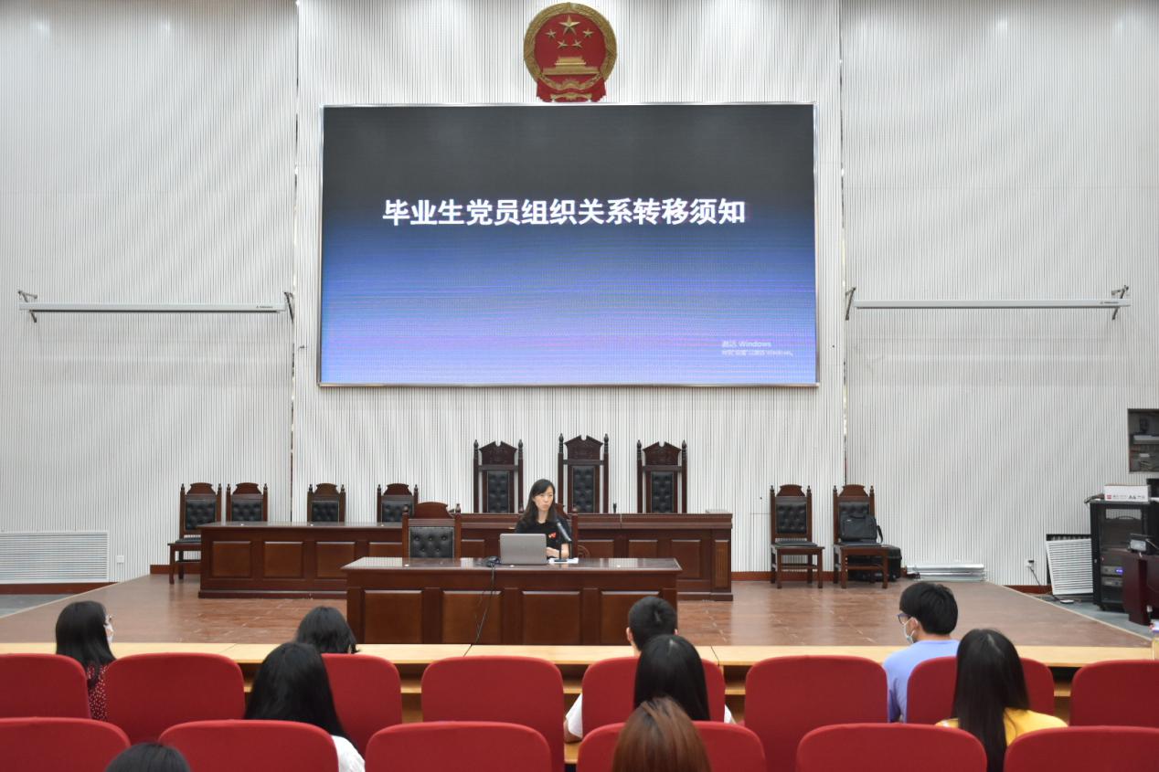 2021届毕业生党员大会在模拟法庭举办,院党委副书记余果为毕业生党员上《重温百年党史,争做时代新人》专题党课,全体2021届毕业生党员参加会议。院团委书记朱瑞萍主持会议。