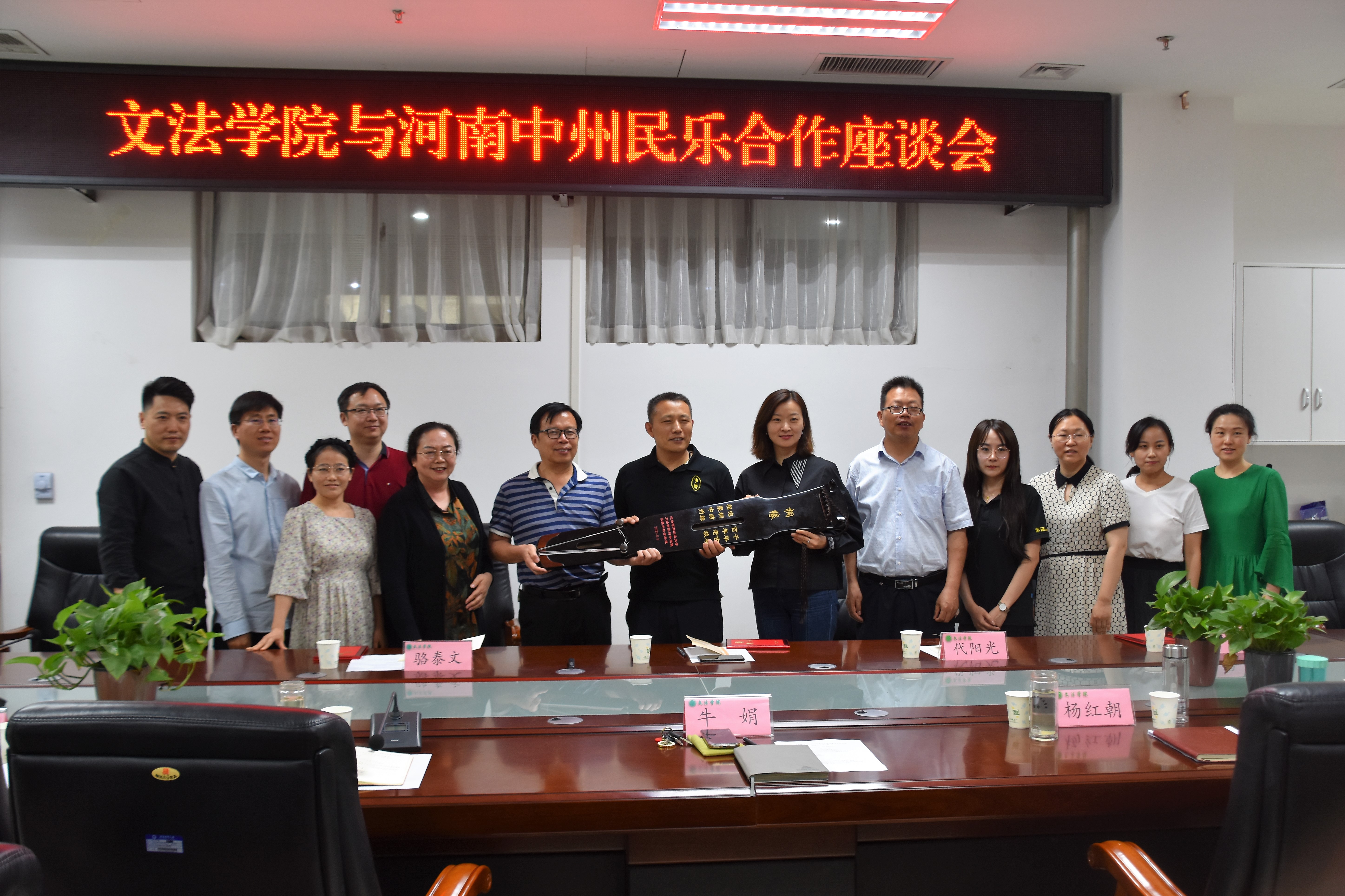 在繁塔楼A310会议室与河南中州民乐乐器有限公司进行校企共建合作签约仪式。河南中州民乐乐器有限公司总经理代胜民、运营总监骆泰文、艺术总监代阳光应邀参会,学院党委书记牛娟、院长王晓勇、副院长杨红朝以及汉语言文学系专业教师代表参加仪式,仪式由杨红朝主持。