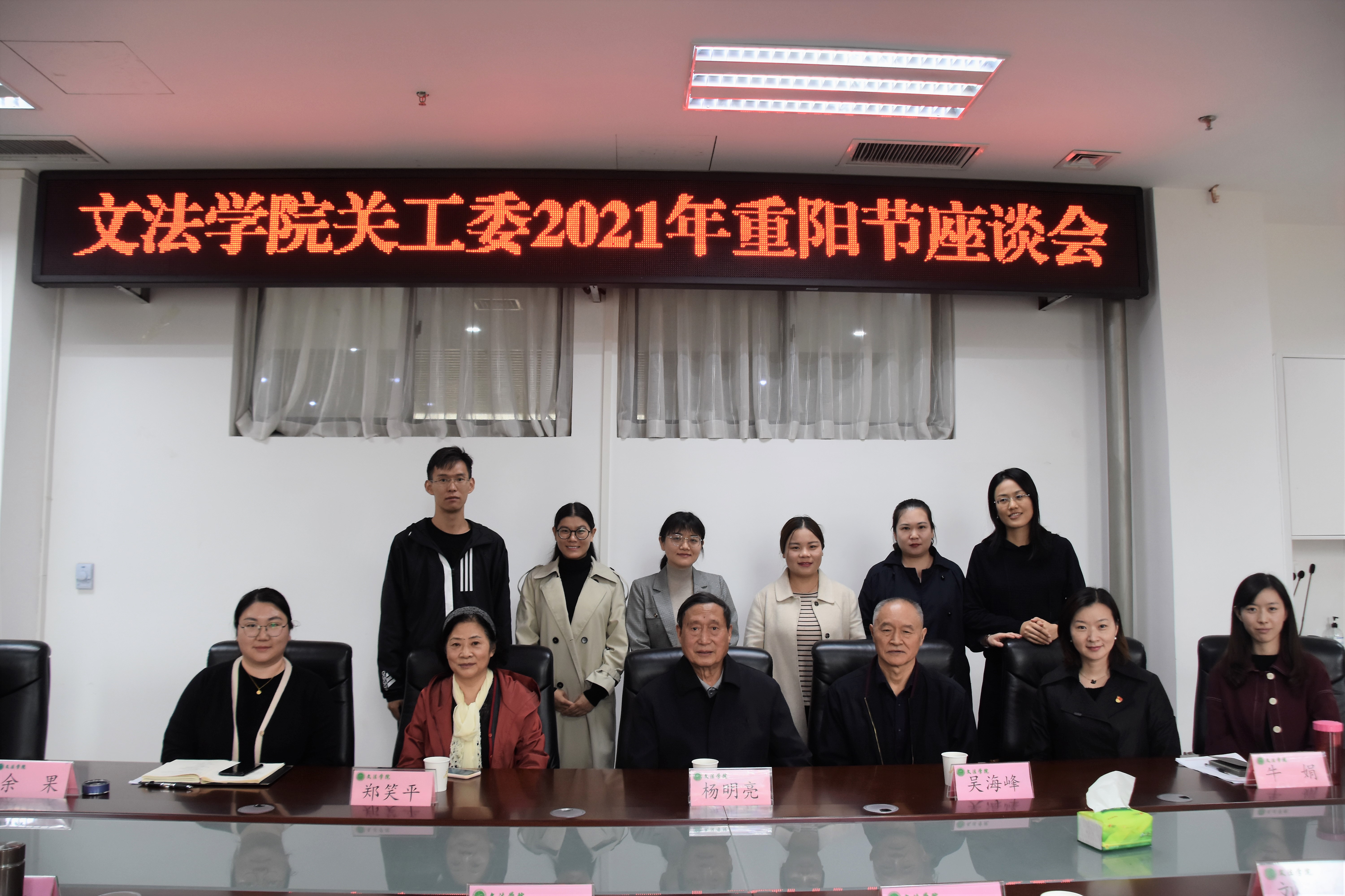 关工委2021年重阳节座谈会,特别邀请院关工委常务副主任杨明亮,关工委委员吴海峰和郑笑平参加座谈会。院党委书记牛娟,党委副书记余果,团委书记朱瑞萍和新入职青年教师代表参加座谈会。会议由余果主持。