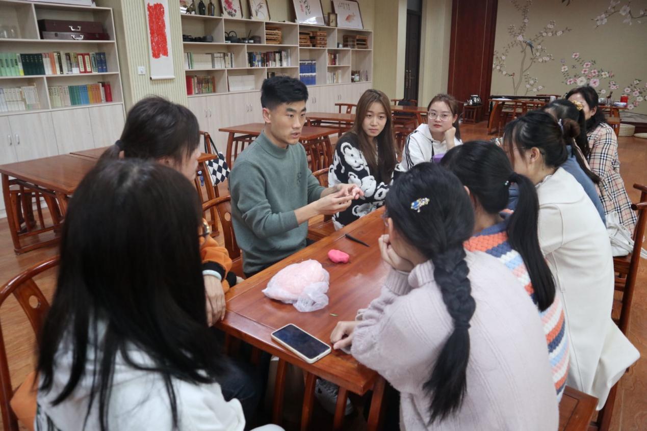 活动初始,刘玉伟简明扼要地讲述了面塑艺术的起源发展和各大流派的文化内涵。在示范环节,他以娴熟手法捏制的作品展示了红军战士、人民警察、医务工作者和消防员的精神风貌。为提高学生的动手能力,刘玉伟向学生分发工具,鼓励学生自主尝试捏制作品。在场学生积极动手操作,在老师的协助指导下,捏制出的作品一个个活灵活现、憨态可掬。