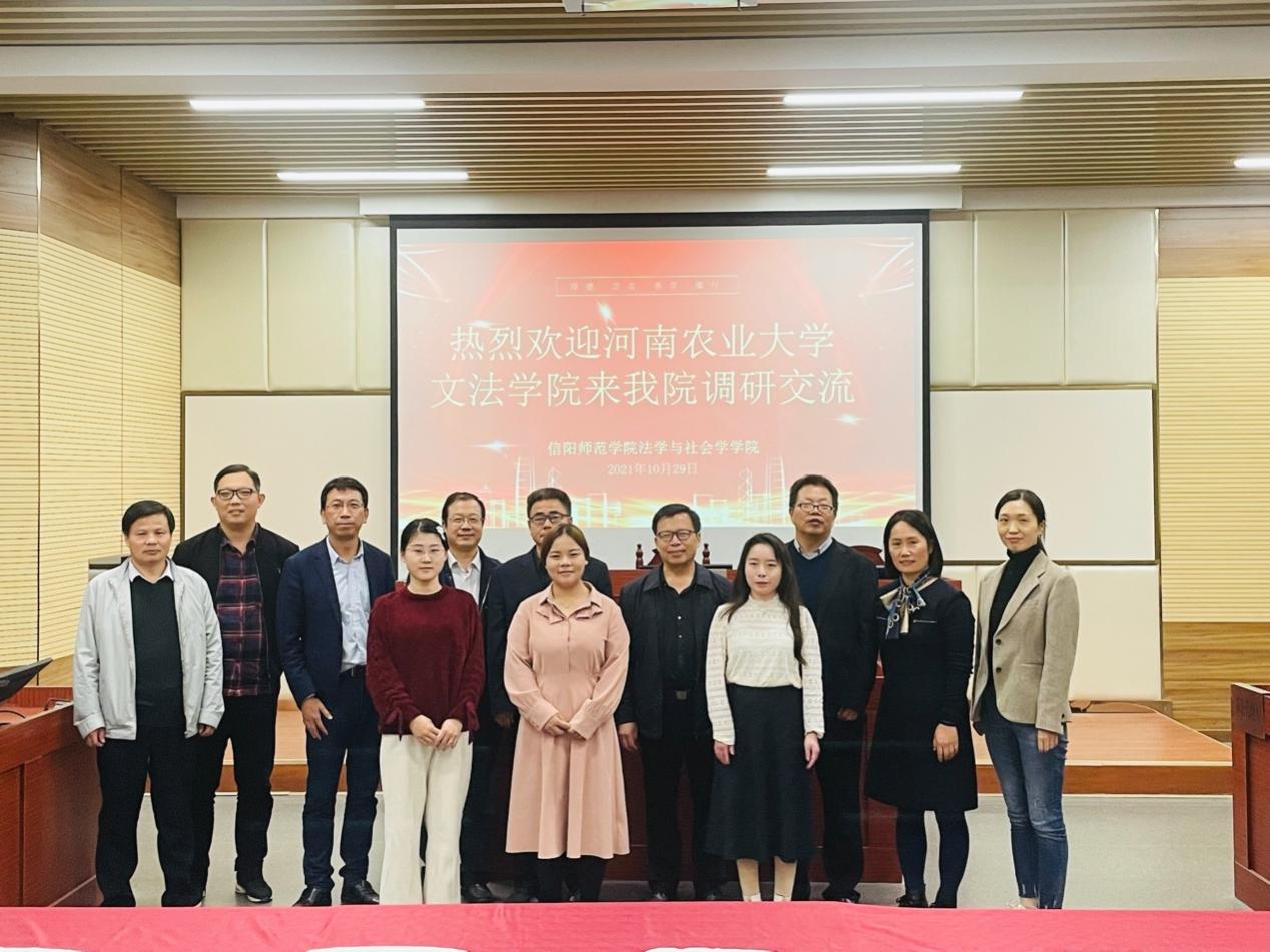 2021年10月29日,院长王晓勇带队法律系教师一行赴信阳师范学院调研考察。信阳师范学院法学与社会学学院副院长古瑞华、副院长张玉鹏、法学系主任黄烨、学院教授李文发等共同出席了交流会。