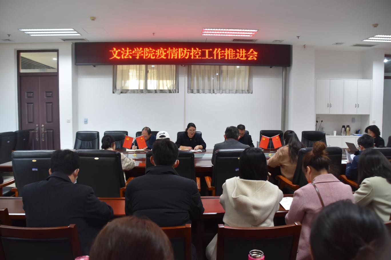 在龙子湖校区繁塔楼A310会议室召开疫情防控工作推进会。学院班子成员及全体教职工参加会议,会议由党委副书记余果主持。