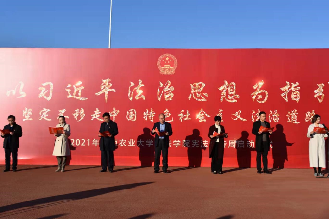于龙子湖校区田径场举办“以习近平法治思想为指引,坚定不移走中国特色社会主义法治道路”宪法宣传周启动仪式。副校长林同保出席仪式,校党委宣传部部长王红艳、党委学工部部长徐峰、政策法规办公室副主任张帅梁、校团委副书记雷雯及91自拍