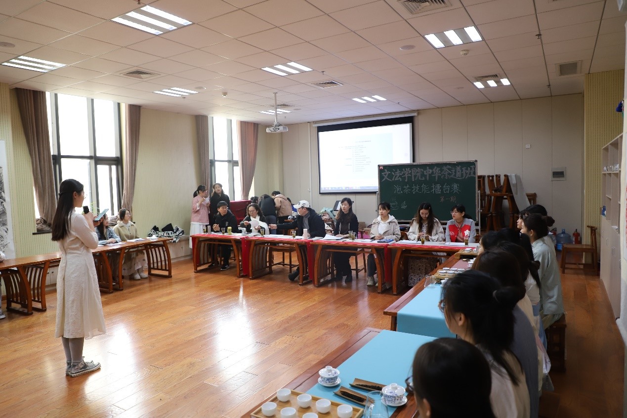 赛前,茶道课老师杨子讲解了泡茶技能擂台赛的比赛规则,并强调本次茶艺冲泡赛以中国茶道精神为指导,以泡好一杯茶和呈现茶艺美为目的,考核学生通过择水选器和对水温、茶水比、浸泡时间等参数的科学设计与调控,充分展现茶的色香味形,以做到茶汤质量和泡茶过程的完美结合。