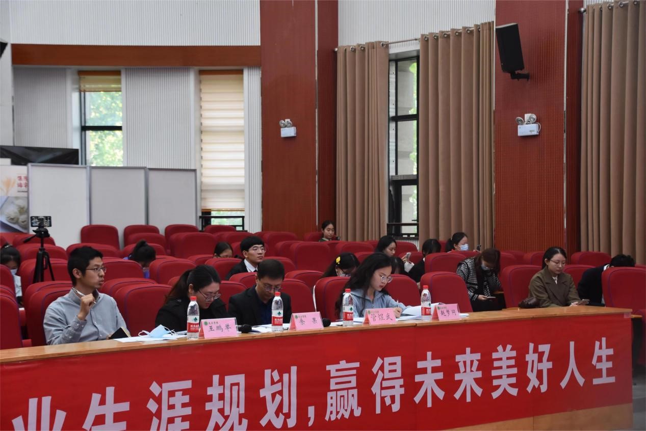 在主持人介绍比赛的活动流程和评分准则后,十位参赛选手依次进行五分钟的自我陈述。他们自信满满、声情并茂地阐述个人职业规划,通过精彩的幻灯片介绍自我、描绘未来。在答辩环节,评委们有针对性地提出问题,并根据参赛选手的表现给出相关建议。