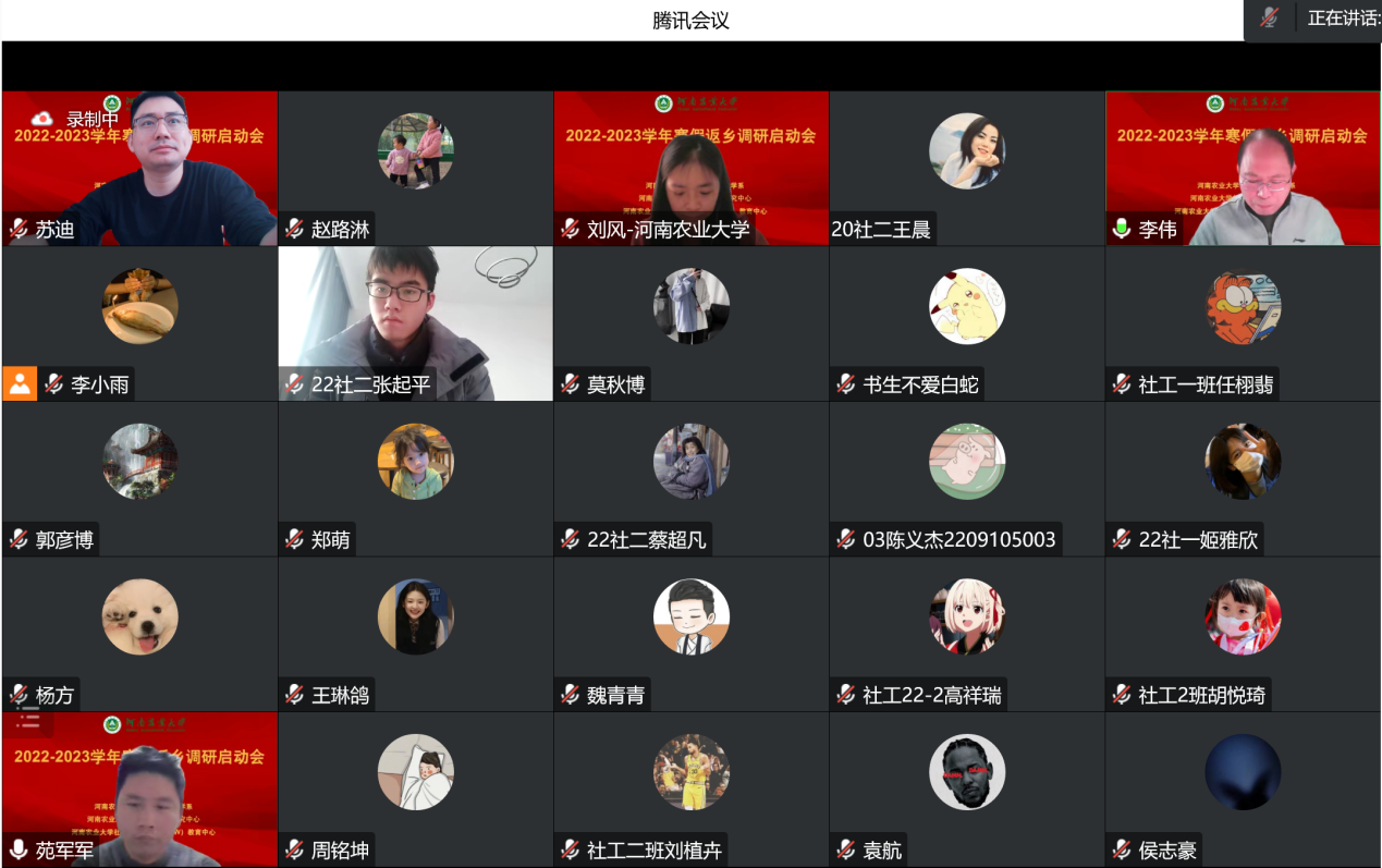 社会学系通过线上形式举办了大学生寒假返乡调研启动会。会议由社会学系副主任刘风主持,副院长李伟,社会学系教师代表参加,2022、2021、2020、2019级的部分本科生、研究生报名参与调研活动。