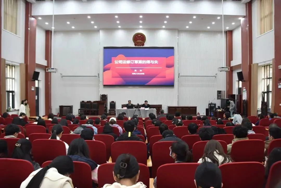 特邀河南大学法学院副教授樊涛在龙子湖校区模拟法庭做“公司法修订稿的得与失”的学术报告。会议由院长王晓勇主持,副院长杨红朝、法律系教师和法学专业20级、21级全体学生参与。