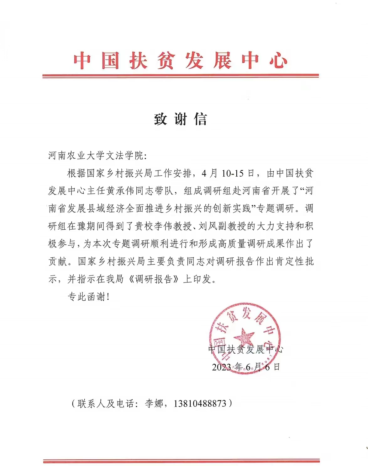 本次调研形成的最终成果得到了国家乡村振兴局主要负责同志的肯定性批示,并在国家乡村振兴局内部刊物《调研报告》上印发。基于调研组在豫期间,李伟、刘风两位同志为调研工作的顺利进行和形成高质量调研成果作出的贡献,中国扶贫发展中心向两位老师发来致谢信。本次调研是我校人文社科教师服务乡村振兴的一次具体行动,未来,他们将会充分发挥其专业和学科优势,与学校同频共振,助力河南乡村振兴事业发展。