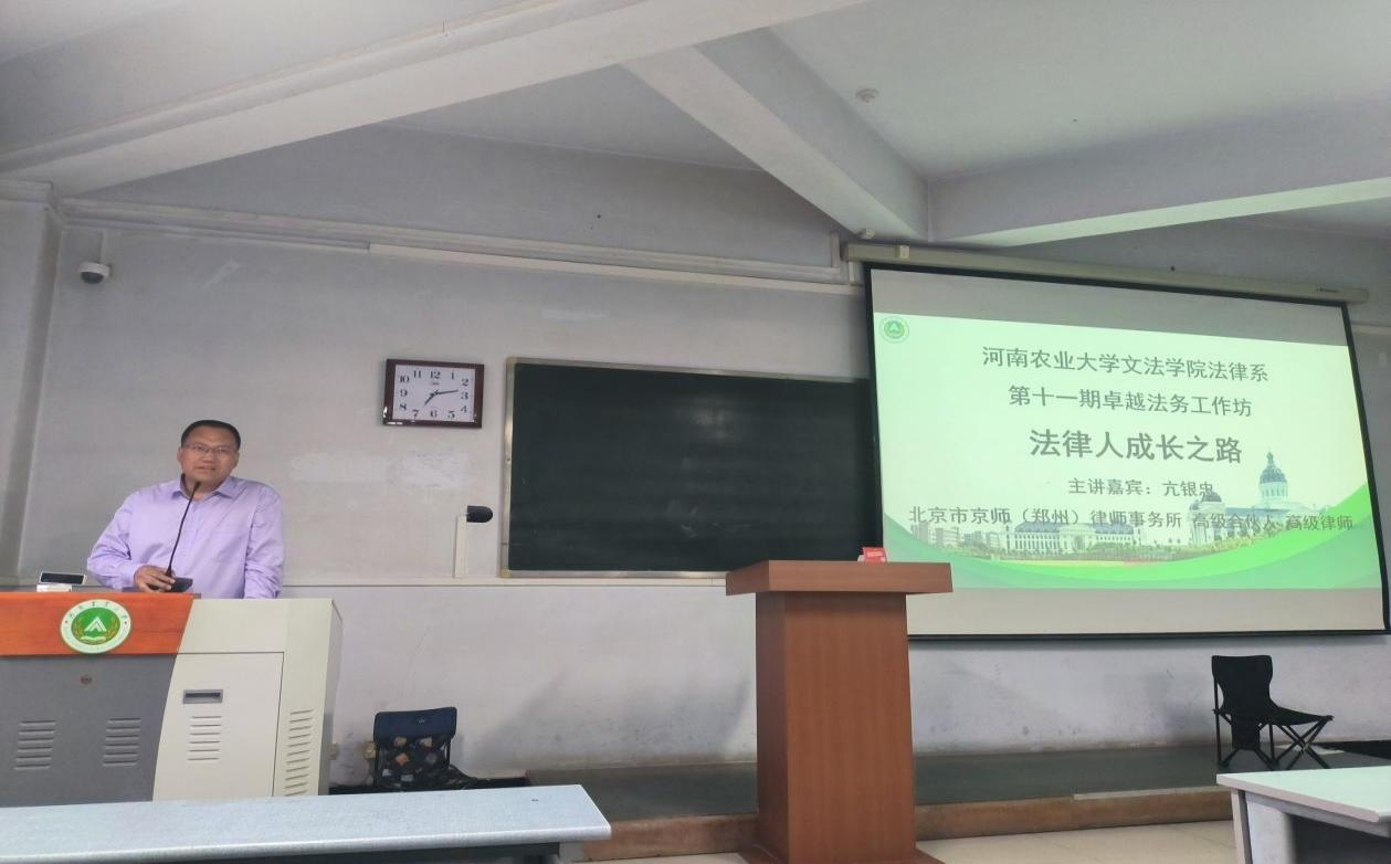 于桃李园学生公寓桃西楼举办主题为“法律人成长之路”的第十一期卓越法务工作坊,特别邀请北京市京师(郑州)律师事务所高级合伙人、高级律师亢银忠进行分享,2022级法学专业全体学生参与,活动由副院长杨红朝主持。