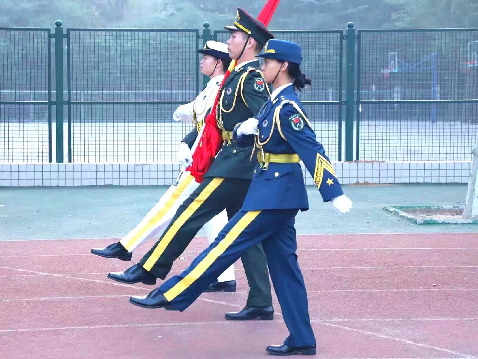 会议伊始,国旗护卫队迈着整齐划一、铿锵有力的步伐,护卫着国旗行至升旗台。随着国歌的响起,国旗在晨光中冉冉升起,全体注目并奏唱国歌,展现着文法学子的爱国情怀。