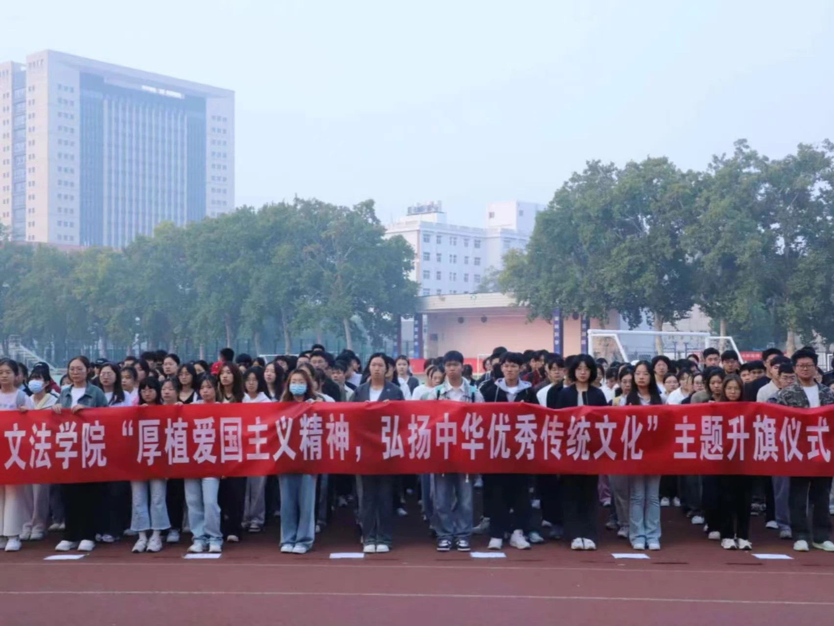于文化路校区田径场举办“厚植爱国主义精神,弘扬中华优秀传统文化”主题升旗仪式。院党委书记牛娟、党委副书记朱瑞萍、院辅导员及2024级全体新生参加活动。仪式由朱瑞萍主持。