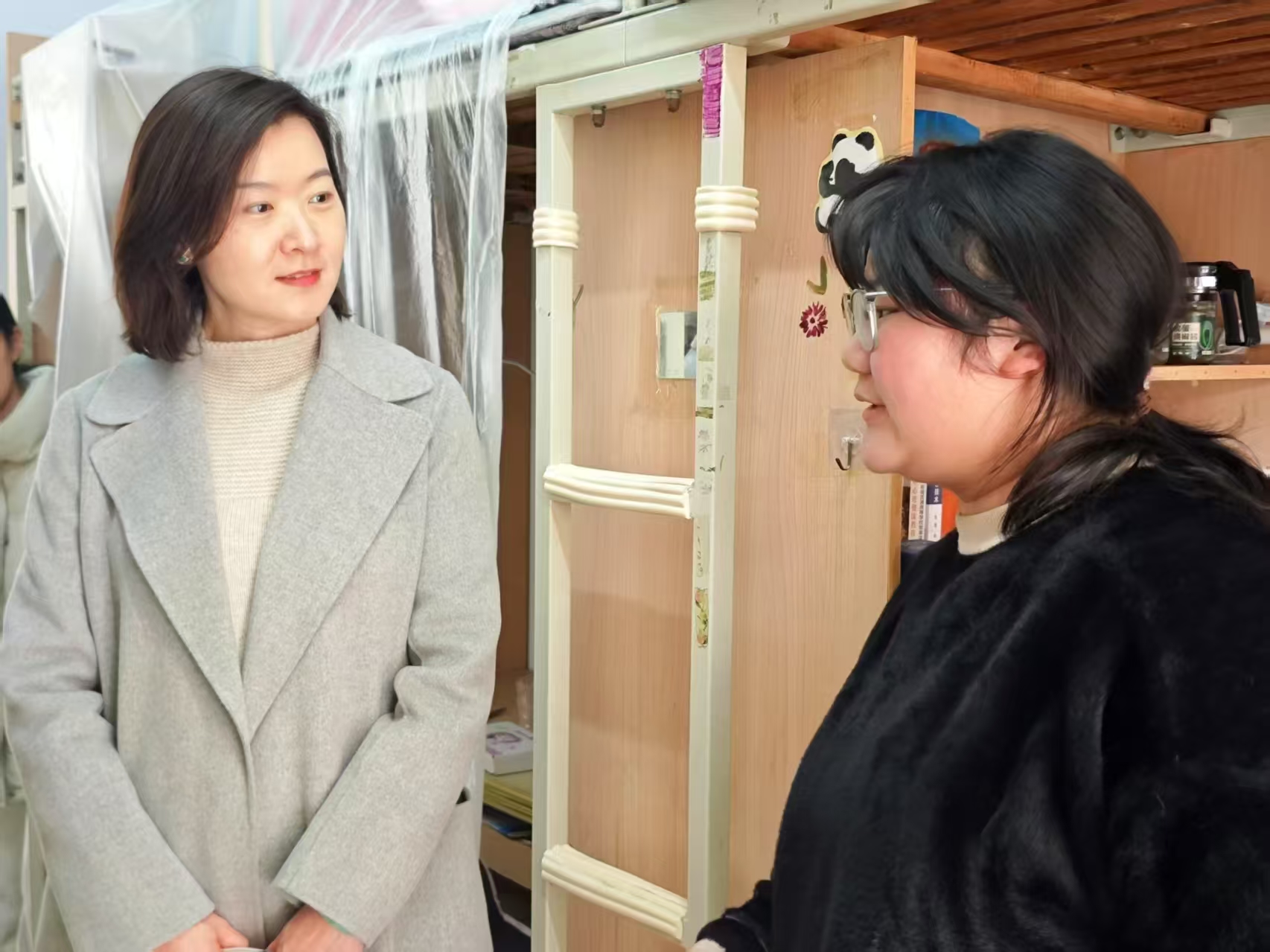 党委书记牛娟、党委副书记朱瑞萍及各年级辅导员深入学生宿舍,开展走访慰问活动,详细了解学生寒假生活、学习进展及开学准备情况,及时送上关怀与鼓励。