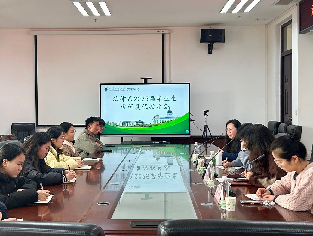 于龙子湖校区繁塔楼A310举办法律系2025届毕业生考研复试指导会。会议由团委副书记赵梦闪主持,法律系副主任赵菊敏、法律系教师徐轶博、法律系教师董鑫出席并作指导,现场气氛热烈,毕业生积极参与。