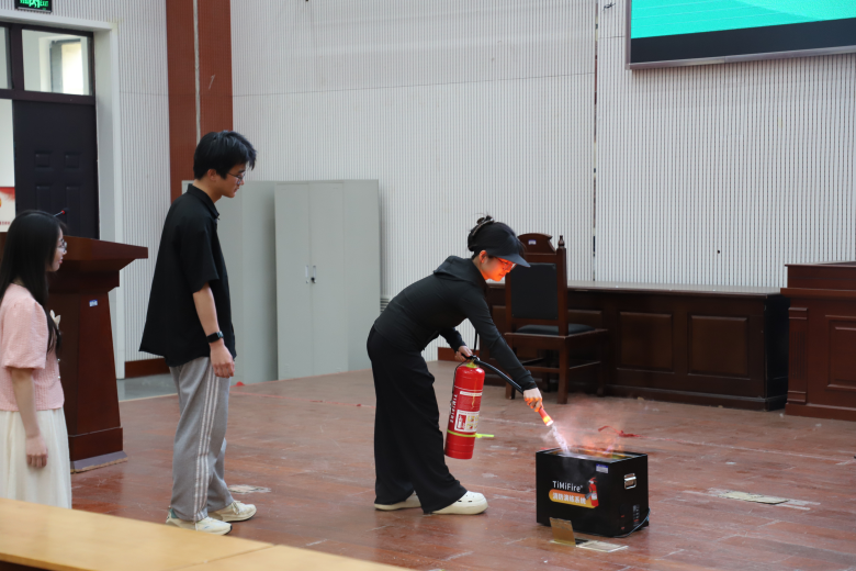 实验实训中心副主任李国超讲解消防安全知识,借助TiMiFire仿真消防演练系统,通过模拟火场发生环境,培训师生掌握灭火器操作步骤。师生们积极参与消防演练,认真学习、操作规范,确保在关键时刻能够熟练运用消防器材。