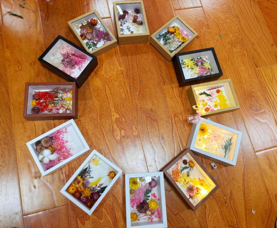 活动伊始,干花相册 DIY 环节正式开启。现场准备了满天星、尤加利叶、小雏菊等十余种干花材料,以及相册本、胶水、装饰贴纸等工具。参与者们积极投入创作,精心挑选干花素材,巧妙搭配色彩与造型,并将干花细心粘贴在相册内页,制作出风格各异的个性化作品。在制作过程中,大家专注于创作,感受干花与艺术融合的独特魅力,身心得到放松。