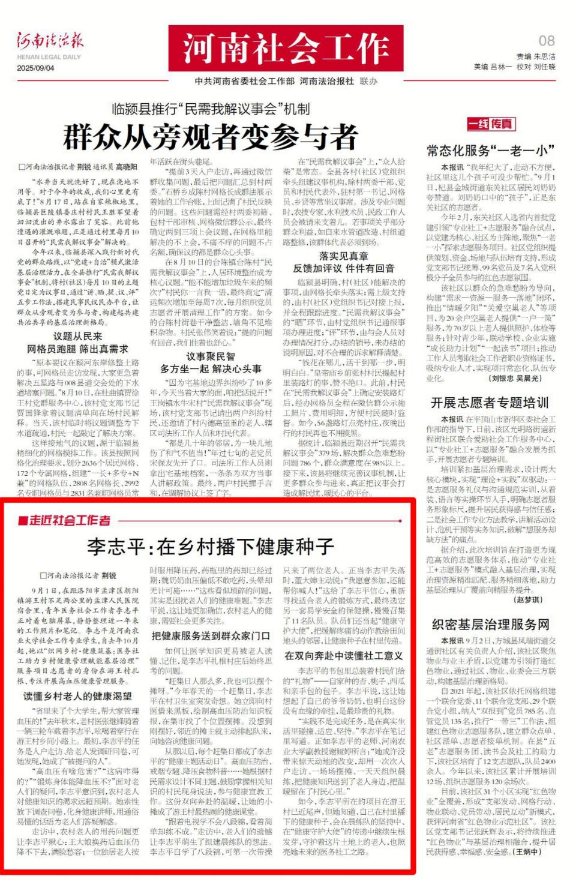23级社会工作专业研究生李志平在“织网乡村·健康筑基:医务社工助力乡村健康管理赋能基层治理”服务项目中的实践事迹,被《河南法治报》“走近社会工作者”专栏刊发报道。