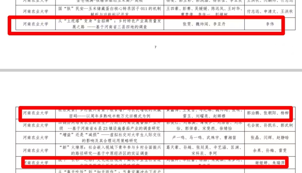 其中,特等奖为:李伟指导《从“土疙瘩”变身“金招牌”:乡村特色产业高质量发展之路 --基于河南省三县四地的调查》;郭治鹏、张朝阳、杨柳青指导《粮辰美景:乡村振兴背景下粮食增产与农民增收的双赢密码--以周年多熟吨半粮万元田模式为例》;谢娅婷、朱瑞萍指导《脱下“长衫”之后:文化适应视角下高校毕业生社会适应的类型学分析及应对策略研究》。