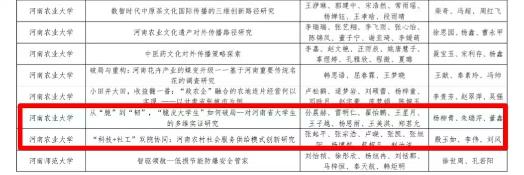 二等奖为:杨柳青、朱瑞萍、董鑫指导《从“脆”到“韧”,“脆皮大学生”如何破局--对河南省大学生的多维实证研究》;殷玉如、李伟、刘风指导《“科技+社工”双院协同:河南农村社会服务供给模式创新研究》。