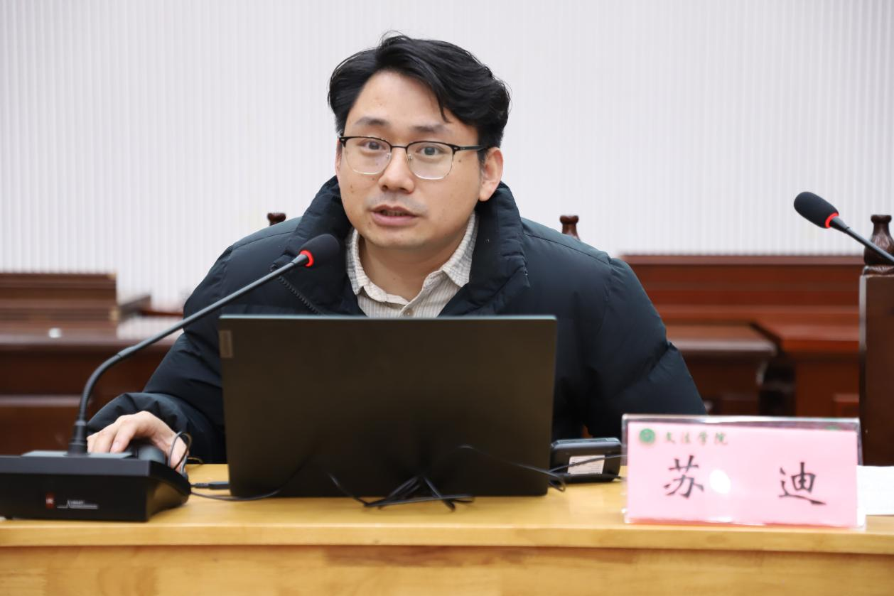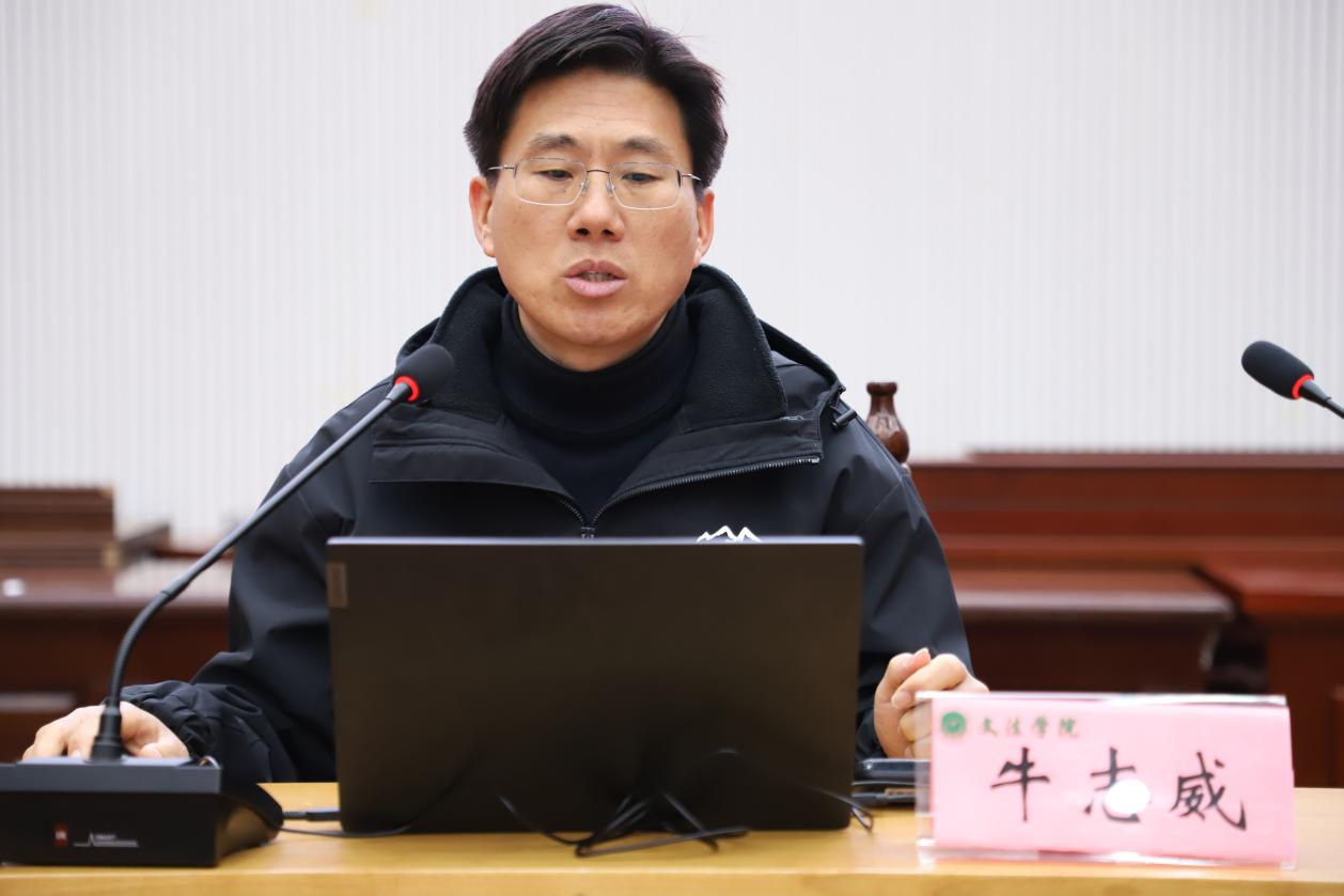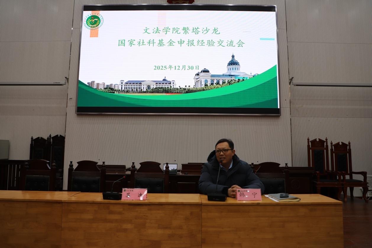 于12月30日在模拟法庭召开国家社科基金申报经验与技巧交流主题繁塔沙龙活动,邀请苏迪和牛志威分享申报国社科项目经验,副院长韩宁和全院教职工参与本次会议。