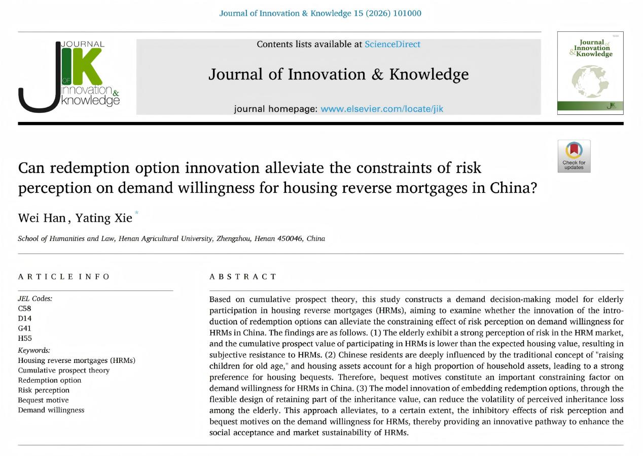 社会学学科韩威团队在SSCI一区(TOP)期刊《Journal of Innovation & Knowledge》(影响因子IF=15.5)上发表了题为《Can redemption option innovation alleviate the constraints of risk perception on demand willingness for housing reverse mortgages in China》的研究论文。该论文系统分析了基于累积前景理论研究住房反向抵押养老保险的相关问题,深入探讨了我国居民养老需求。