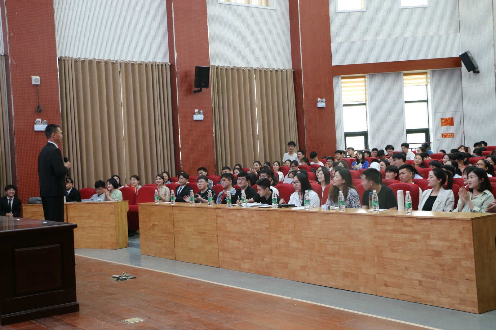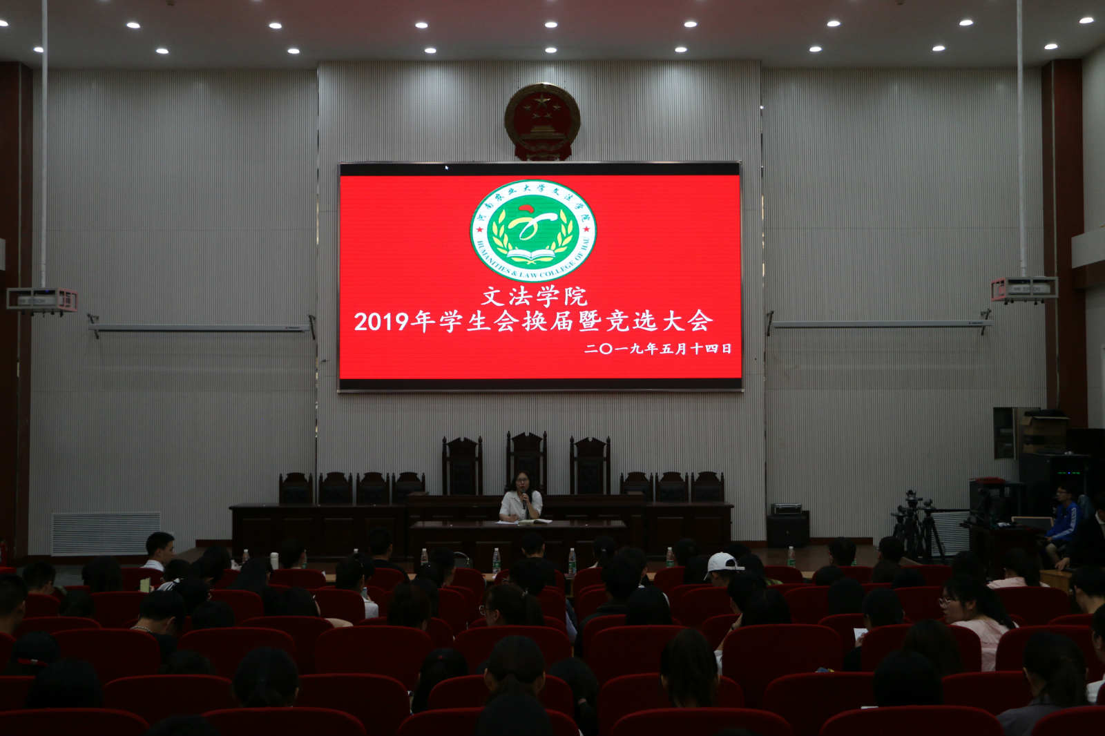 于2019年5月14日下午三点在模拟法庭举行了学生会换届暨竞选大会。院团委书记沈倩茹、团委副书记赵蕊以及各班班委参加了本次换届暨竞选大会。