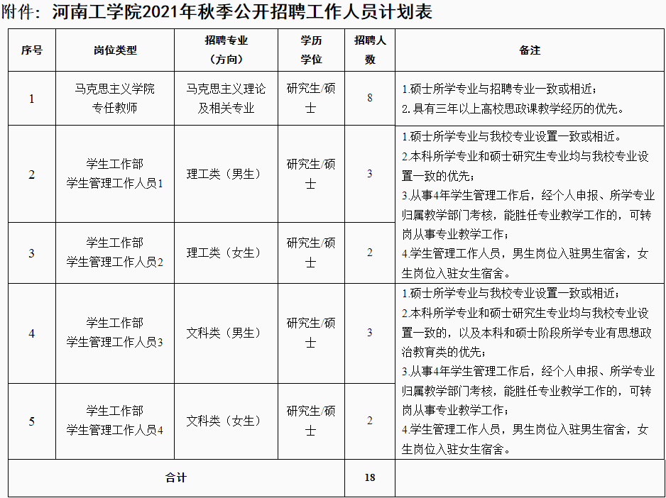 招聘思政课专任教师8名、学生管理工作人员10名,详见《河南工学院2021年秋季公开招聘工作人员计划表》(附件)。