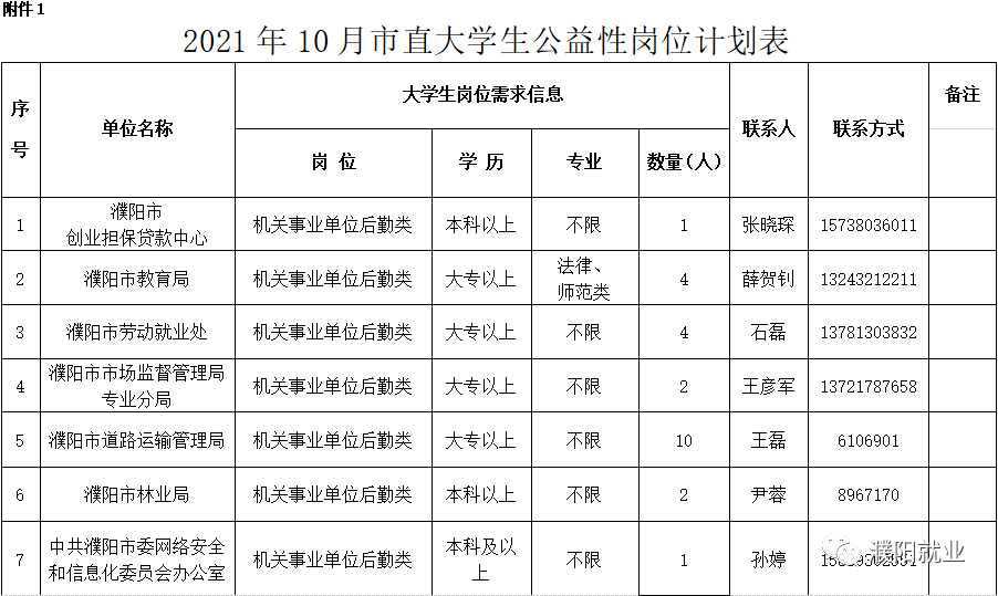 1、见附件1《2021年10月市直大学生公益性岗位计划表》