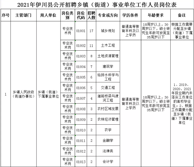 招聘岗位、招聘人数、招聘岗位条件等详见《2021年伊川县公开招聘乡镇(街道)事业单位工作人员岗位表》