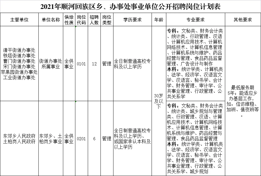 附件1:2021年顺河回族区乡、办事处事业单位公开招聘岗位计划表