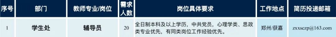 邮件标题请注明XX(应聘部门)—XX(应聘岗位)—XX(专业)—XX(学历)—XX(学校)—XX(姓名),如:信息学院—计算机网络教师—计算机科学与技术—硕士—郑州大学—张三;(备注:高层次人才请注明高层次人才—XX(应聘岗位)—XX(专业)—XX(学历)—XX(学校)—XX(姓名)个人简历应包含学历、工作经历,是否党员、家庭住址、所获荣誉、职称、科研成果、最快上岗时间等情况。