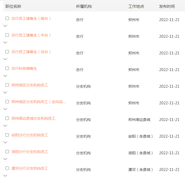 4. 分支机构(运营条线定向):从事分支机构运营条线相关工作不低于三年,培养分支机构运营类专业人才。工作地点:郑州地区