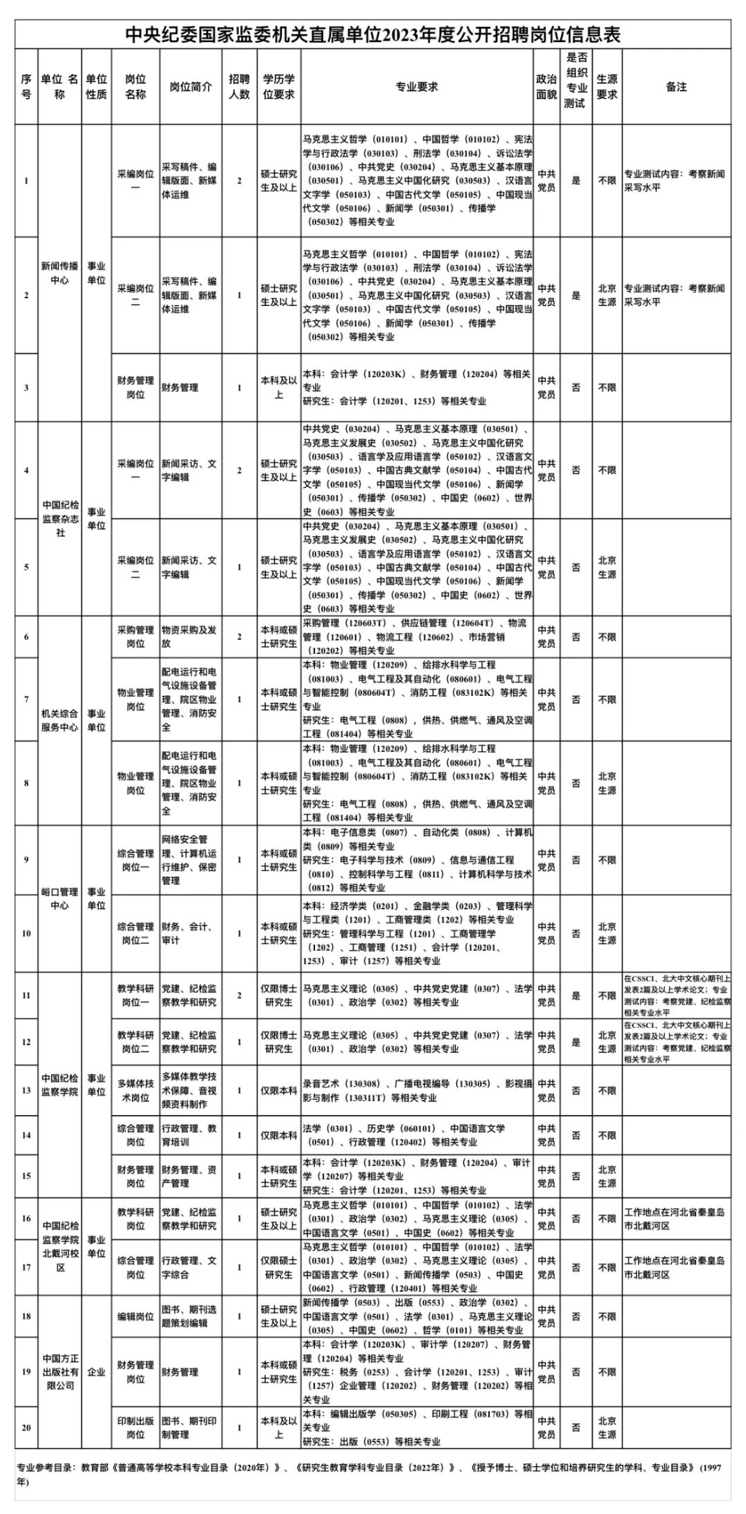 此次招聘涉及20个岗位、计划招聘24人,具体岗位及资格条件详见《中央纪委国家监委机关直属单位2023年度公开招聘岗位信息表》。其中,有关岗位专业条件参考教育部公布的专业目录(《普通高等学校本科专业目录(2020年)》、《研究生教育学科专业目录(2022年)》、《授予博士、硕士学位和培养研究生的学科、专业目录(1997年)》)。报名应聘人员在报名时对专业有疑问的,可拨打报名咨询电话进行咨询了解。